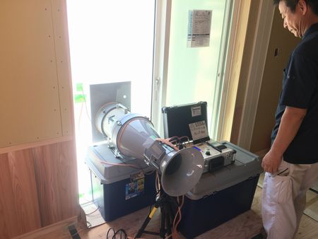 ファンが廻り家中の空気を排出していきます。5分ほど測定中、隙間風が入ってこないか家中をチェックしながら