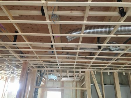 防震吊り木(写真の黒色の部材)で天井の木材を固定しプラスターボードを張っいきます。