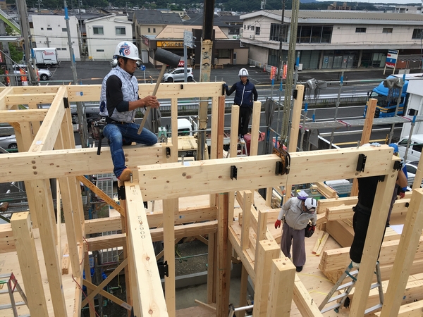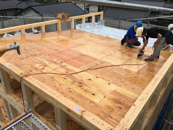 あいにく午後は少し雨降りの中での作業でしたが、無事に屋根まで完成し上棟工事を終えることができました。