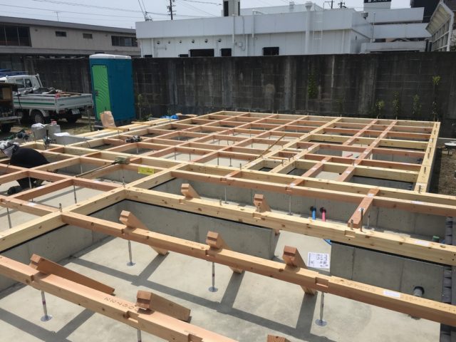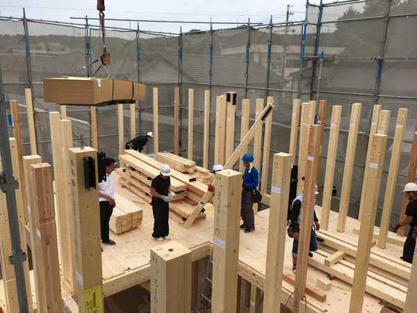 STEP2 立てた柱に2階の床梁を架けていきます。その床梁に2階の床合板伏せていきます。