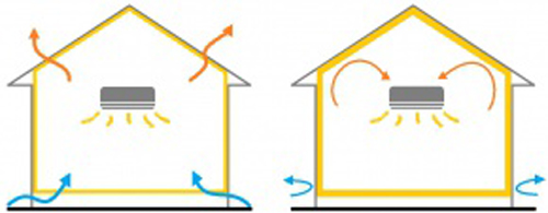 この流出は屋外と屋内の温度差が大きいほど、外の風速が早いほど、流出は大きくなってしまいます。