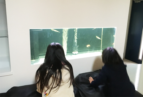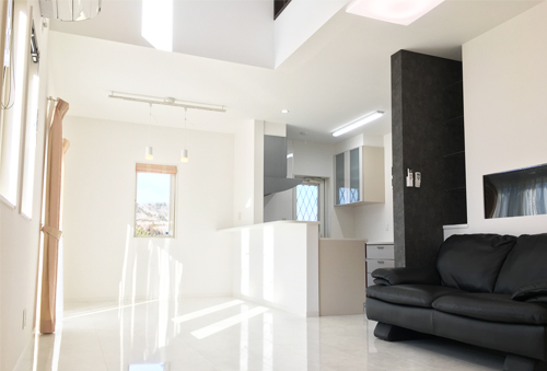 大理石調のフローリングが映えるLDKはホワイト&ブラックでモノトーン&モダンな仕上がりに。和室と解放的につなげることで広々とくつろげるスペースに。埋め込まれた大型水槽の中を泳ぐ熱帯魚が帰宅を出迎えてくれる水族館のようなリビングとなりました。